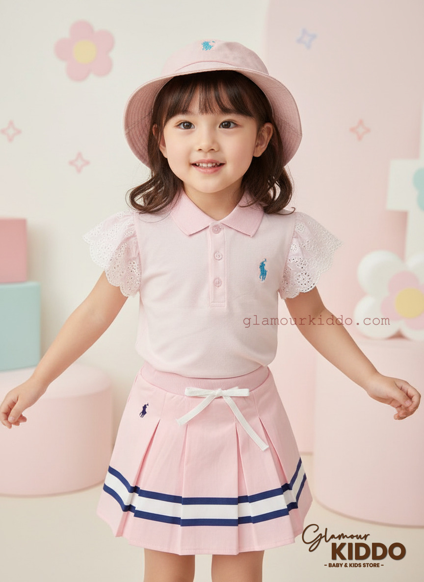 This adorable Ralph Lauren girl's 3pcs set includes a pink polo shirt, a matching skirt, and a hat. The polo shirt features short, eyelet-trimmed sleeves and a classic polo collar with a three-button placket. The iconic Ralph Lauren logo is embroidered on the chest. The skirt is a pleated design with navy and white stripes near the hem and an embroidered logo. It has an elastic waistband with a decorative white bow. The matching pink hat features the Ralph Lauren logo embroidered on the front. This set is perfect for a stylish and comfortable look for any young girl.
