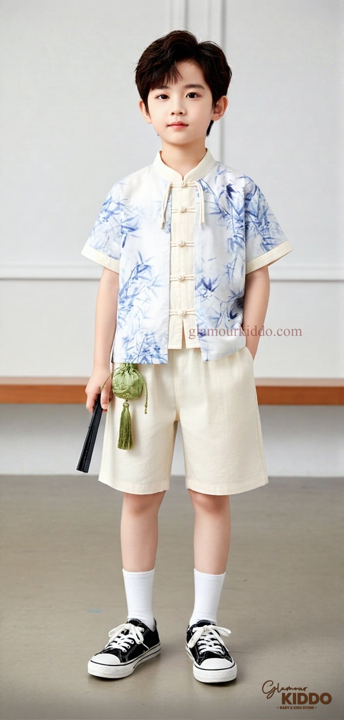 This adorable outfit set is perfect for your little boy! It features a traditional Chinese style design that is both stylish and comfortable. The set includes a short-sleeved top and shorts, making it ideal for warmer weather. The top has a mandarin collar and a frog button closure, adding to its authentic look. The fabric appears to be lightweight and breathable, ensuring your child stays cool and comfortable all day long. The shorts have an elastic waistband for a snug and adjustable fit. This outfit is perfect for special occasions, cultural events, or simply adding a touch of unique style to your child's wardrobe. This outfit set is suitable for boys who want to embrace a unique and stylish look. It's perfect for parents who appreciate traditional designs and want their children to stand out from the crowd. Whether it's for a family gathering, a cultural celebration, or just a fun day out, this outfit set is sure to make your little boy look and feel his best.