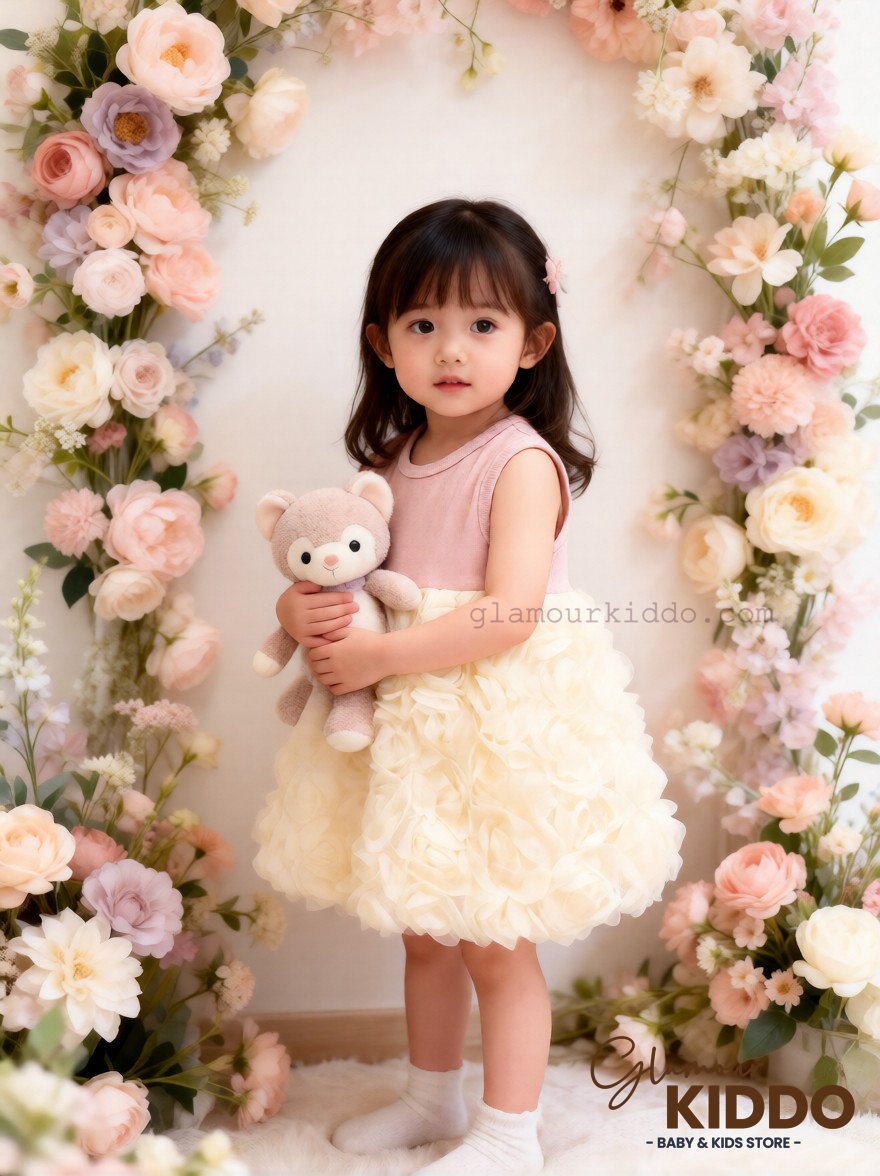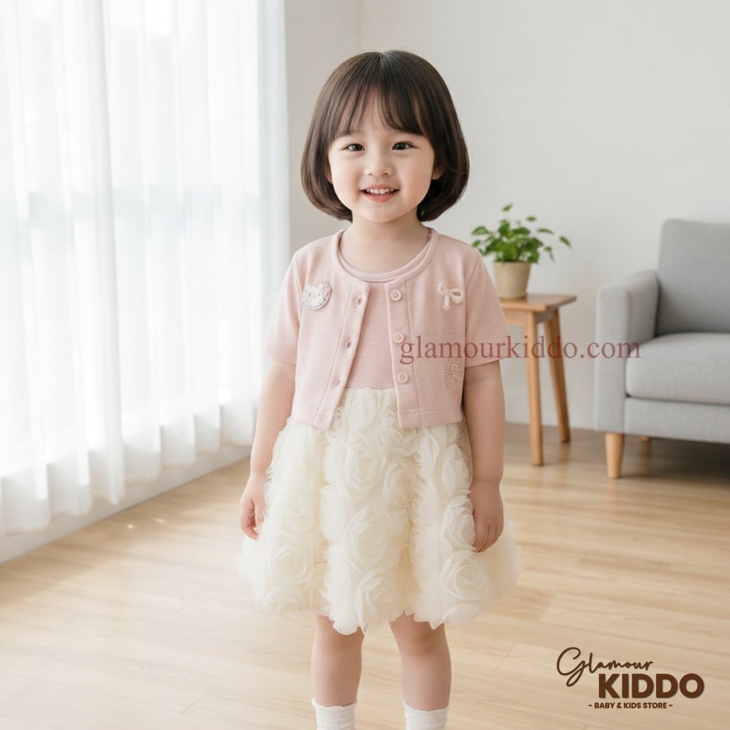 Dress your little one in this charming two-piece set, perfect for special occasions or everyday elegance. This delightful ensemble features a soft pink cardigan paired with a beautiful ivory tulle dress, creating a sweet and sophisticated look for your toddler girl. The cardigan is a lovely shade of pink, with a classic round neckline and short sleeves. It features delicate button closures down the front, adorned with subtle embellishments like a small bow and a cute applique. The cardigan is designed to be a comfortable and stylish layering piece, perfect for keeping your child warm while adding a touch of elegance to her outfit. The dress boasts a soft, stretchy bodice that ensures a snug and comfortable fit. The skirt is made of layers of dreamy ivory tulle, fashioned into a rose pattern. This unique design adds volume and texture to the dress, making it a standout piece. The dress is perfect for twirling and playing, while still looking picture-perfect. This dress and cardigan set is ideal for parents who want their children to look fashionable and feel comfortable. It's suitable for various occasions, from family gatherings to birthday parties. The high-quality materials ensure durability and easy care, making it a practical addition to your child's wardrobe. Key features and benefits: * Two-piece set includes a cardigan and a dress * Soft pink cardigan with button closures and delicate embellishments * Ivory tulle dress with a unique rose pattern * Comfortable and stretchy bodice for easy wear * Perfect for special occasions or everyday wear * High-quality materials for durability and easy care * Ideal for toddler girls who love to dress up