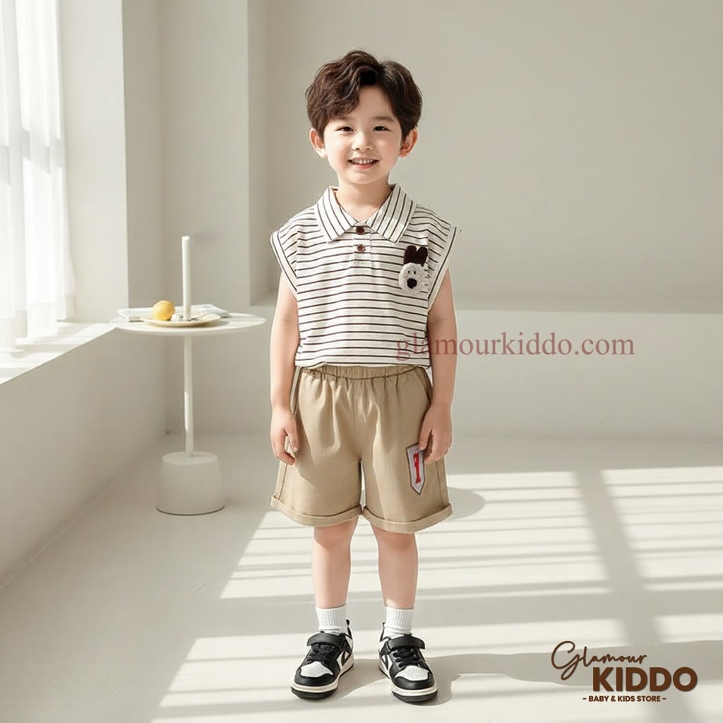 This adorable boys' outfit set is perfect for warm weather and casual occasions. The set includes a sleeveless polo shirt and a pair of coordinating shorts. The polo shirt features a classic striped pattern in neutral tones, a traditional collar with a two-button placket, and a cute bear applique on the chest. The shorts are a solid khaki color with an elastic waistband for a comfortable fit and a decorative patch on one leg. The set is made from soft, breathable materials, ensuring your child stays comfortable all day long. This outfit is ideal for playdates, family outings, or everyday wear. It’s easy to care for and designed to withstand the rigors of childhood. Dress your little one in style with this charming and versatile set.
